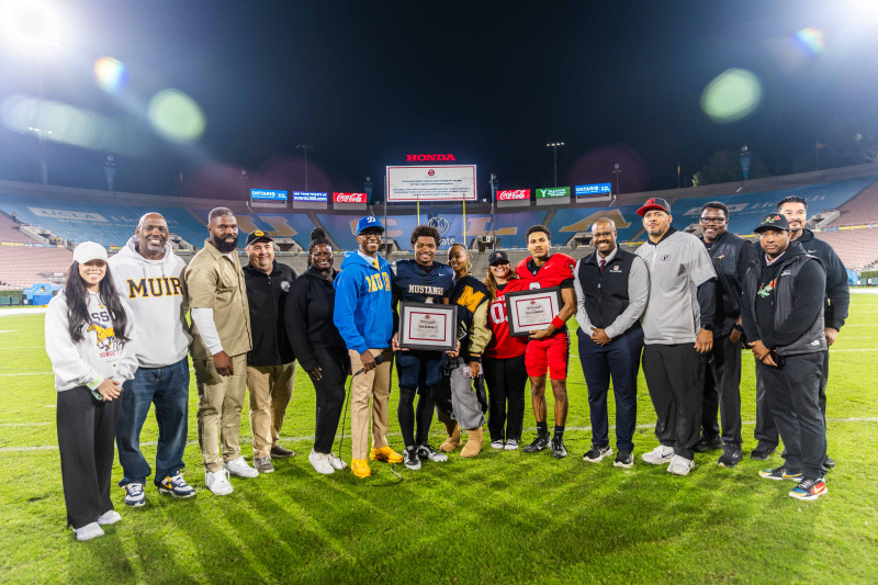 The 2023 awards were presented to two PUSD students, Deon Mejia from Pasadena High School, and Brandon Valencia from John Muir High School for outstanding sportsmanship during the game.